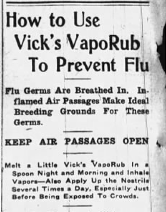 Advertisements that certain foods, drugs, or other products could prevent or treat the flu abound. Buffalo Enquirer, Feb. 24, 1920.