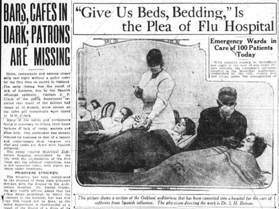 Early in the pandemic, people across the country appeared reluctant to visit eating establishments and other places with public gatherings. Meanwhile, those with Spanish Flu symptoms filled up hospitals and emergency wards, pushing them to capacity. Oakland Tribune, Oct. 24, 1918.