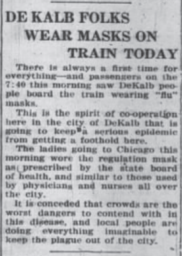 The routines of life were suddenly interrupted by the sight of people in gauze “flu” masks. Mask ordinances were among the first regulations adopted at the onset of the Spanish Flu pandemic. The DeKalb Daily Chronicle, Oct. 19, 1918.