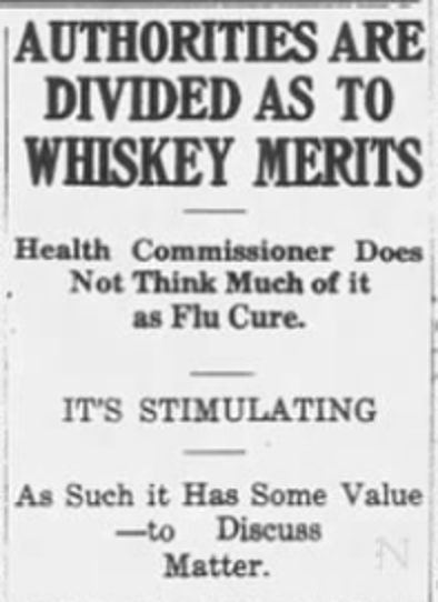 In the lead-up to the 18th Amendment’s ratification on January 16, 1919 and after it went into effect on January 16, 1920, opponents of Prohibition and many in the public-health and medical professions proclaimed that whiskey held medicinal value. The Anti-Saloon League and other proponents of Prohibition dismissed such propositions as unsubstantiated political ploys or simply nonsense. Here is an example of such merits applied to the Spanish Flu. The Buffalo Commercial, Jan. 23, 1920