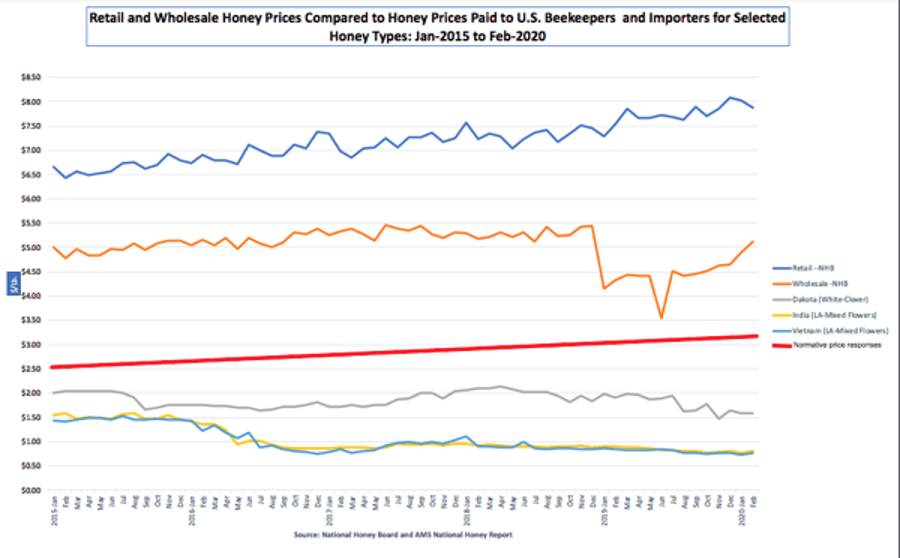As the chart above shows, over the past five years, the wholesale price for honey in the U.S. has remained about $5.00 or more per pound with some dips in the market [Ron Phipps p. 2]. At the same time, the price paid to U.S. beekeepers has steadily declined. For example, Dakota beekeepers went from being paid $2.00 per pound in 2015 to $1.50 per pound in 2020 [Ibid]. During the same period, India and Vietnam honey import prices declined in the same time period from about $1.50 per pound to $0.75 per pound [Ibid]. The explanation for this paradox is adulteration. Or, as Ron Phipps puts it, this “means there have been high profits for a few and huge losses for beekeepers” [Ibid at p.1].