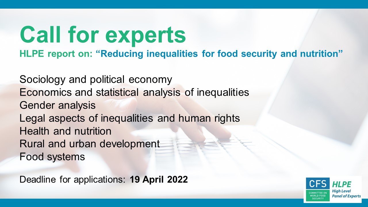 During its 46th plenary session, the Committee on World Food Security requested the HLPE to produce a report on “Reducing inequalities for food security and nutrition”. As part of the report elaboration process, the HLPE is now calling for interested experts to apply to the ad-hoc Project Team for this report.